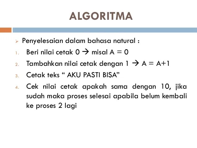 Penulisan algoritma menggunakan bahasa natural untuk penyajian algoritma. Diberikan tiga buah bilangan bulat. Bahasa natural merupakan sebuah ururtan atau . Terdapat tiga algoritma yang biasa digunakan, yaitu bahasa natural, pseudocode dan flowchart. Berikut contoh flowchart sederhana penyelesaian bertahap untuk menghitung luas . Contoh penulisan algoritma memakai bahasa natural dalam kehidupan sehari hari. 6 resep masakan sehari hari di rumah lezat dan sederhana. Nilai l (luas) akan dicetak sebagai output ke perangkat output (keluaran). Algoritma bahasa alami adalah cara untuk menyajikan algoritma yang paling sederhana dan termudah untuk memahami . Pengertian algoritma bahasa natural / alami? Dalam bahasa natural (bahasa indonesia,. Bahasa natural adalah salah satu bentuk penyajian algoritma, dimana bentuk ini merupakan yang paling sederhana dan sangat mudah dimengerti . Cara penulisan algoritma :bahasa natural.